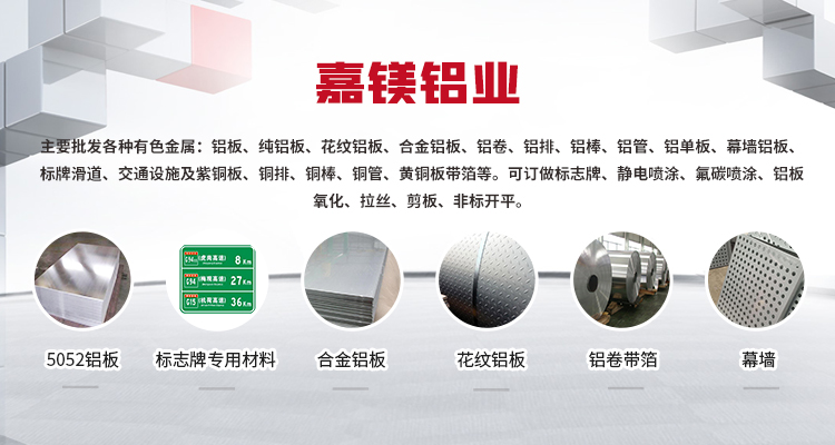 嘉鎂鋁業(yè)(上海)有限公司主要批發(fā)各種有色金屬:鋁板、純鋁板、花紋鋁板、合金鋁板、鋁卷、鋁排、鋁棒、鋁管、鋁單板、幕墻鋁板、標(biāo)牌滑道、交通設(shè)施及紫銅板、銅排、銅棒、銅管、黃銅板帶箔等??捎喿鰳?biāo)志牌、靜電噴涂、氟碳噴涂、鋁板氧化、拉絲、剪板、非標(biāo)開(kāi)平。公司的優(yōu)質(zhì)產(chǎn)品在多個(gè)行業(yè)中均有發(fā)揮優(yōu)良的性能,表現(xiàn)極佳,廣泛應(yīng)用于航空、汽車(chē)、船務(wù)、電子、醫(yī)療等行業(yè)...